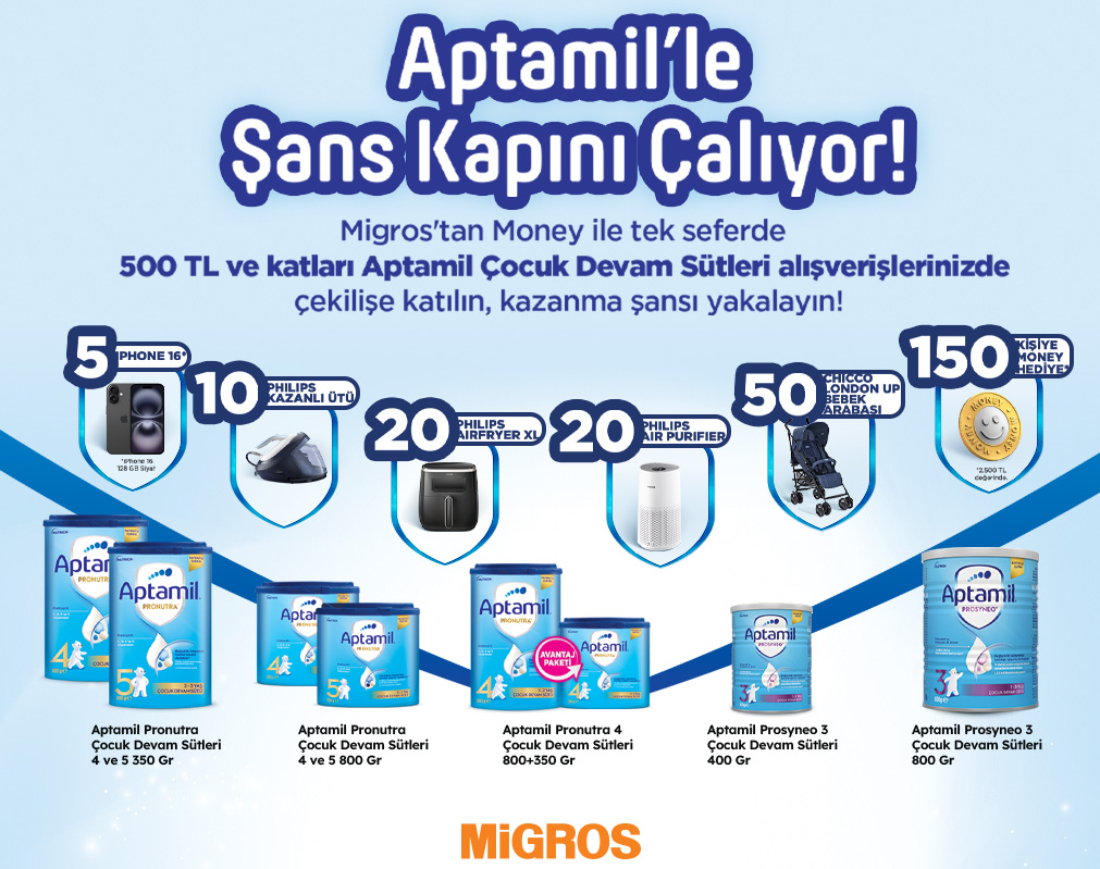 Bebeğiniz için en iyisi anne sütüdür. Eksikliğinde doktorunuza danışınız. Sağlıklı yaşam için dengeli, çeşitli beslenmelidir. Bu kampanya Migros Ticaret A.Ş. tarafından Milli Piyango İdaresi’nin 24.12.2025 tarihli ve E-24951361-255.01.02-83305 sayılı izni ile düzenlenmektedir. 01.01.2026 (09:00) - 31.03.2026 (23:00) tarihleri arasında Türkiye genelindeki tüm Migros, 5M Migros, Migrosjet Mağazaları’ndan, Migros Sanal Market veya Migros Hemen’den Numil Gıda Ürünleri San. ve Tic. A.Ş.’ye ait Aptamil Çocuk Devam Sütü 4 800 + 4 350 Gr, Aptamil Devam Sütü 4 800 Gr, Aptamil Devam Sütü 5 800 Gr, Aptamil Devam Sütü 5 350 Gr, Aptamil Devam Sütü 4 350 Gr, Aptamil Devam Sütü 4 1200 Gr, Aptamil Devam Sütü 4 1200 + 800 Gr, Aptamil Pronutra 4 Çocuk Devam Sütü 1-2 Yaş 750 Gr, Aptamil Pronutra 5 Çocuk Devam Sütü 2-3 Yaş 350 Gr, Aptamil Pronutra 4 Çocuk Devam Sütü 1-2 Yaş 1200 Gr, Aptamil Pronutra 4 Çocuk Devam Sütü 1-2 Yaş 800 Gr, Aptamil Pronutra 5 Çocuk Devam Sütü 2-3 Yaş 800 Gr, Aptamil Pronutra 4 Devam Sütü 800+350 Gr, Aptamil Pronutra 4 Devam Sütü 1-2 Yaş 1200+800 Gr, Aptamil Pronutra 4 Devam Sütü 1-2 Yaş 1200+800 Gr, Aptamil Prosyneo Çocuk Devam Sütü 3 400 Gr, Aptamil Pronutra 4 Devam Sütü 800+350 Gr ve Aptamil Pronutra Devam Sütü 800 + 800 Gr ürünlerinden herhangi birini satın alan müşteriler arasında yapılacak çekilişle 18 adet iPhone 16 128 GB (birim değeri: 64.999 TL) hediye edilecektir. Kampanyaya katılım için Money veya Money Bonus üyesi olmak gerekmektedir. Katılım için alışveriş fişinde yer alan bilgiler eksiksiz ve doğru olmalıdır. Katılımın sorumluluğu müşteriye aittir. Çekiliş 10.04.2026 tarihinde yapılacak olup, kazananlar 14.04.2026 tarihinde ilan edilecektir. Kazananlara ayrıca SMS ile bilgi verilecektir. Kampanya kapsamında kazanılan hediyeler nakde çevrilemez, devredilemez. Kazanılan hediyeler 31.05.2026 tarihine kadar teslim edilecektir. Kampanya Milli Piyango İdaresi’nin izni ile düzenlenmiştir. Vergi ve diğer yasal yükümlülükler kazananlara aittir.
